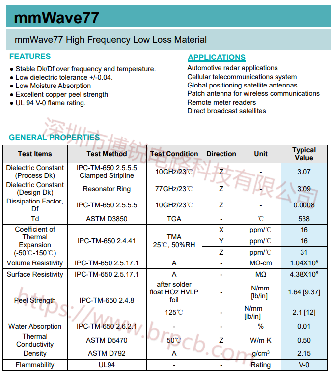 mmWave77覆铜板是一款无玻璃布强化、添加了填料的PTFE复合均质材料,具有优异的热稳定性和电气性能。