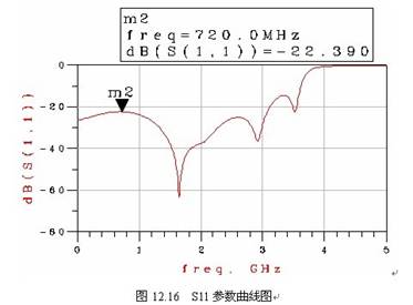 单击工具栏上的simulate按钮或是点击simulate→simulate,当仿真结束后,系统会自动弹出一个数据显示窗口,在数据显示窗口中插入一个S21参数的矩形图,再点击maker→New,可在图中加一标记,如图12.15所示。从图中可以看出,S21参数曲线是一个低通滤波器的形状,但是与设计指标的要求还有一定的差距。以同样的方式插入一个S11参数的矩形图,加上一个Marker点,如图12.16所示。从图中可以看出,S11在通带内基本满足工程设计的要求,但是还有待于进一步改善,使端口的反射系数更小。