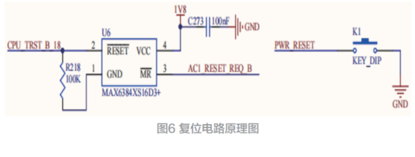 电路可设计复位键,按下后可关闭核心板上所有电源,实现给整板断电复位的功能。如图 6 复位电路所示。