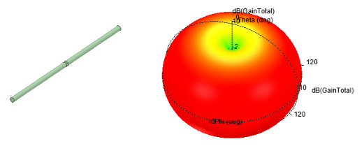 结合实际1.55GHz偶极子天线设计,给出应用实例。为了验证等效电路的准确性,这里使用Python建立一个简单的偶极子天线,图11和图12分别是该天线的辐射特性和S曲线。