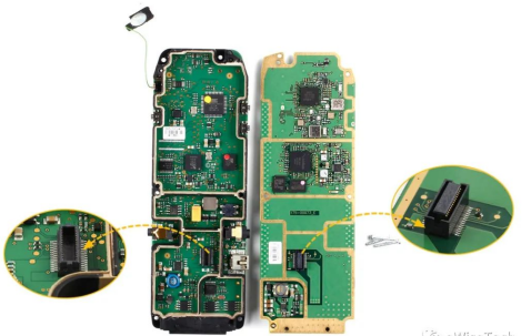 随后拆解手机主板,手机主板上方有采用插针式连接的扬声器,而连接手机扬声器模块镶嵌在后壳顶部,扬声器配有白色防护盖,模块与后壳之间配有泡棉材料。卫星天线通过RF同轴线连接主板,后壳左下角镶嵌1枚转子马达。