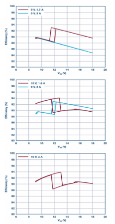 图5.LT8390A系统的输出在5V、9V和15V输出之间平滑转换,同时保持向输出的连续功率输送