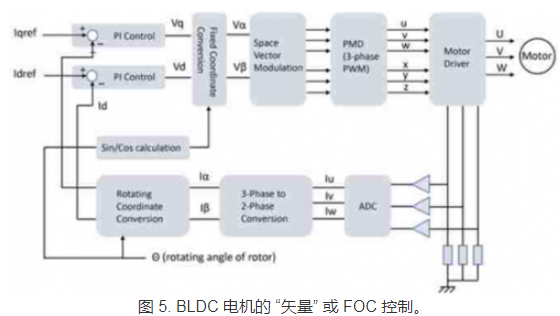 将目标值与补偿反锁信号比较,其差值送入比例 -积分 (PI) 控制器。该信号通过反向克拉克和帕克变换过程,为桥式驱动电路中的开关产生驱动信号,应用 PWM 以形成正弦电流,其有效值对应于所需转矩。图 5 为该方案示意图。