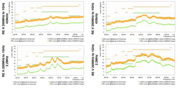 图10显示了MPQ4323-AEC1在200MHz和1GHz范围内进行传导发射和辐射发射的CISPR25 5类标准EMC测试结果。
