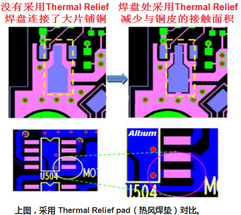 既然知道了问题点就可以有解决的方法,一般我们都会要求采用所谓Thermal Relief pad(热风焊垫)设计来解决这类因为大片铜箔连接元件焊脚所造成的焊接问题。如下图所示,左边的布线没有采用热风焊盘,而右边的布线则已经采用了热风焊盘的连接方式,可以看到焊盘与大片铜箔的接触面积只剩下几条细小的线路,这样就可以大大限制焊垫上温度的流失,达到较佳的焊接效果。