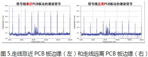 图 5 显示了通过频谱分析仪近场探头在 PCB 下方测量结果(测试数据在100MHz左右频段杂波为环境底噪)。通过下面对比数据,能直观地看出,信号走线靠近板边(左)比信号走线远离板边(右)的谐波噪声最多高出 20dB。