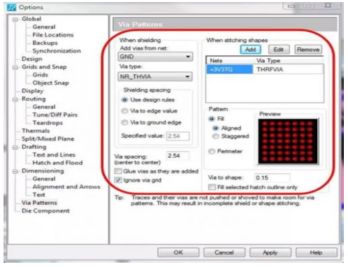 射频设计的另一个重要方面是确保正确地屏蔽带过孔的区域。尽管此任务可由设计人员手动进行,但这个过程极其耗时。如果 PCB 设计工具能够自动完成此过程,将可以缩短设计周期时间并确保符合您的所有设计规则。利用此类工具,设计人员可以指定过孔模式生成规则,而将剩余的工作全部交由 PCB 设计工具完成。